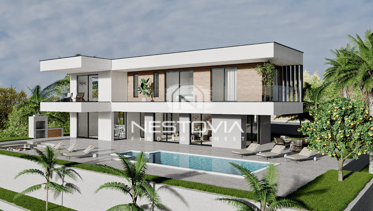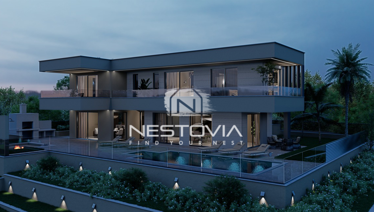 This unique, modern villa with a net area of 250 m² is situated in a prestigious and private location in the picturesque village of Vinišće. Situated on a 723 m² plot, the property offers spectacular panoramic views of the bay, mountains, and city, which can be admired from both the spacious, covered terraces and the luxurious, glass-enclosed interiors.