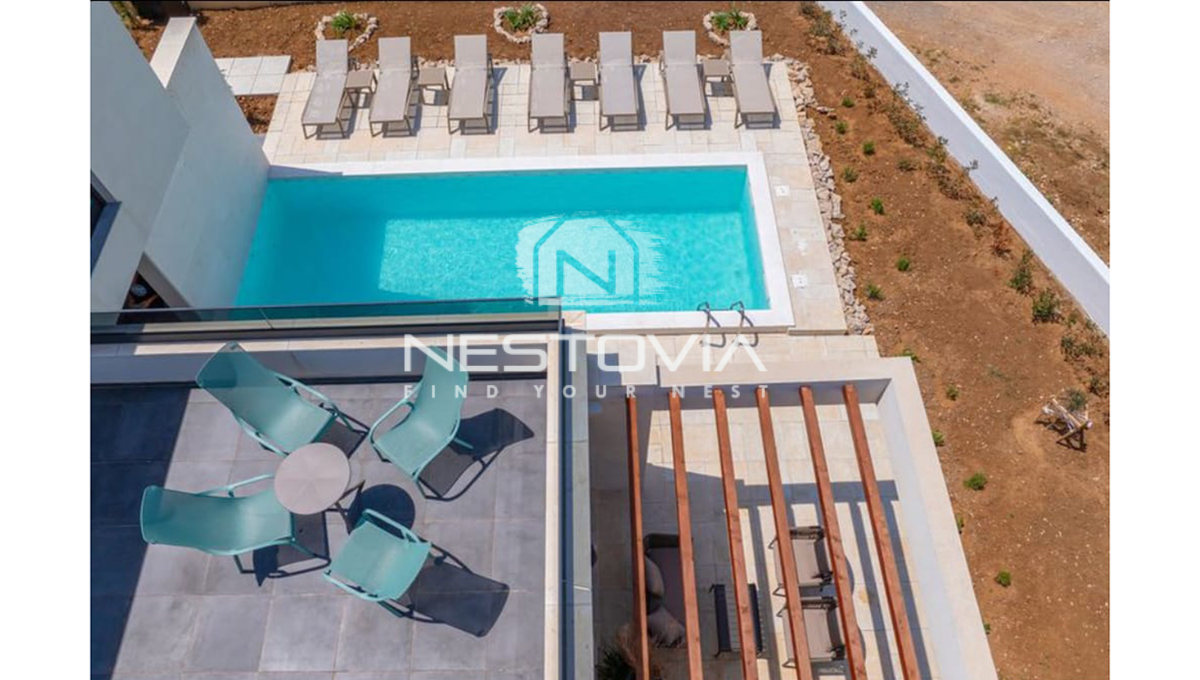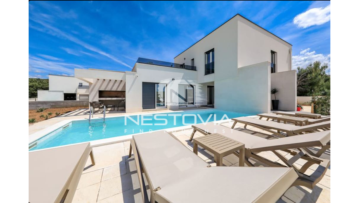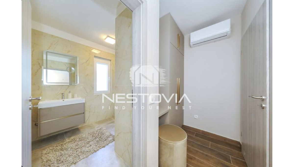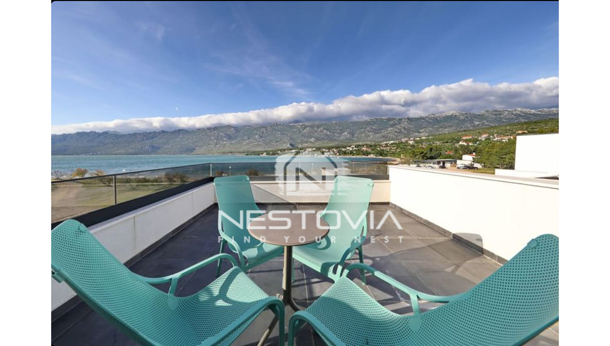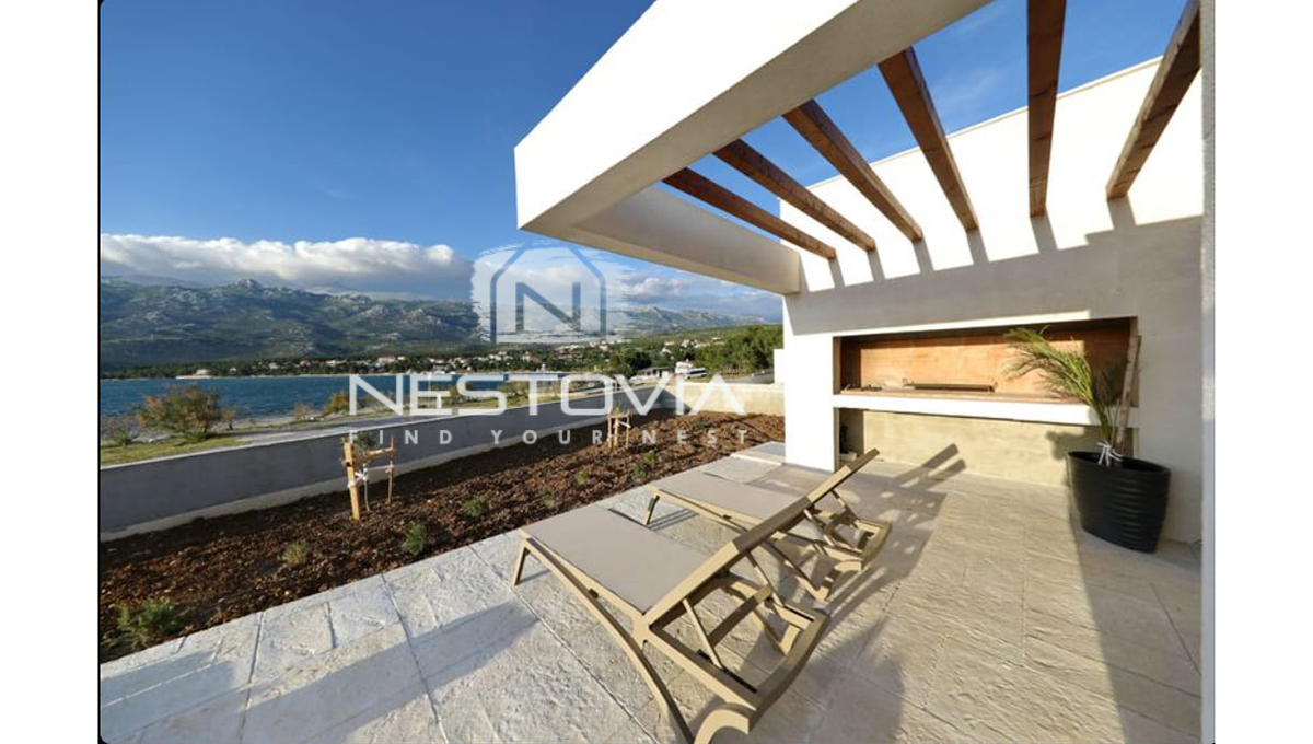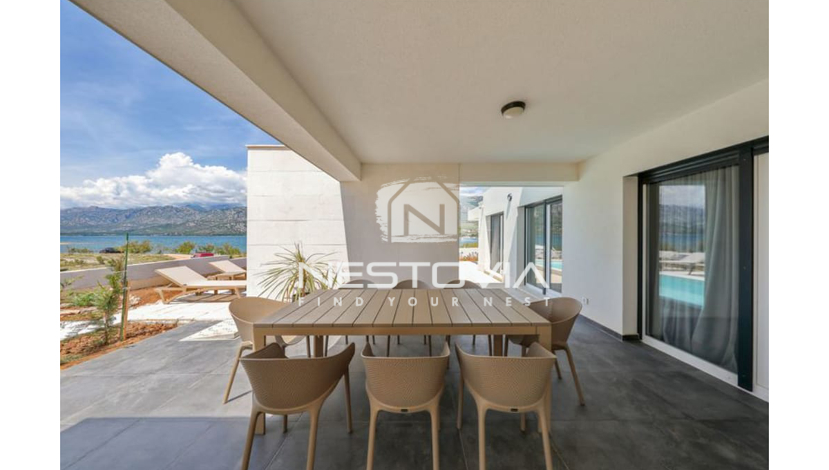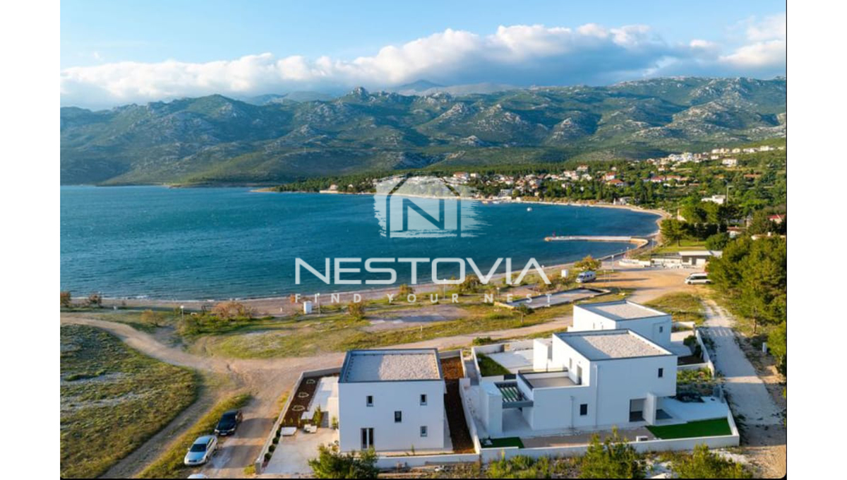 The master bedroom opens onto a large, elevated terrace, which is ideal for sunbathing, relaxing, and admiring the stunning views of the Velebit mountain range, which delight every day. Outside, there is a beautiful outdoor swimming pool and a terrace with a barbecue, perfect for socializing and spending time outdoors. In the immediate vicinity of the property, there is a sandy beach only 30 meters away, and in the area, there is a beach bar, barbecue bar, grocery store, church, and numerous attractions.
