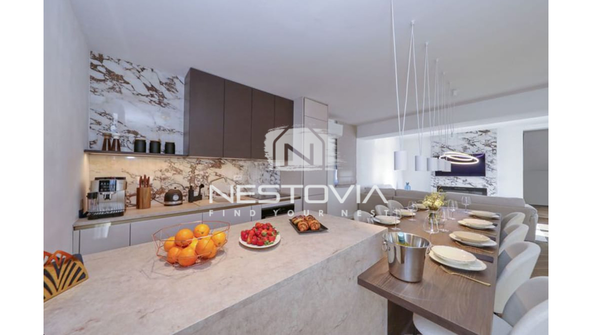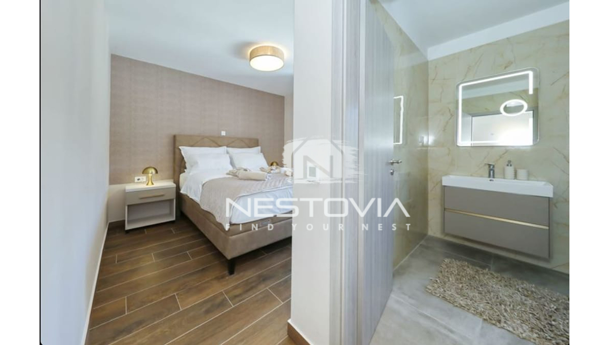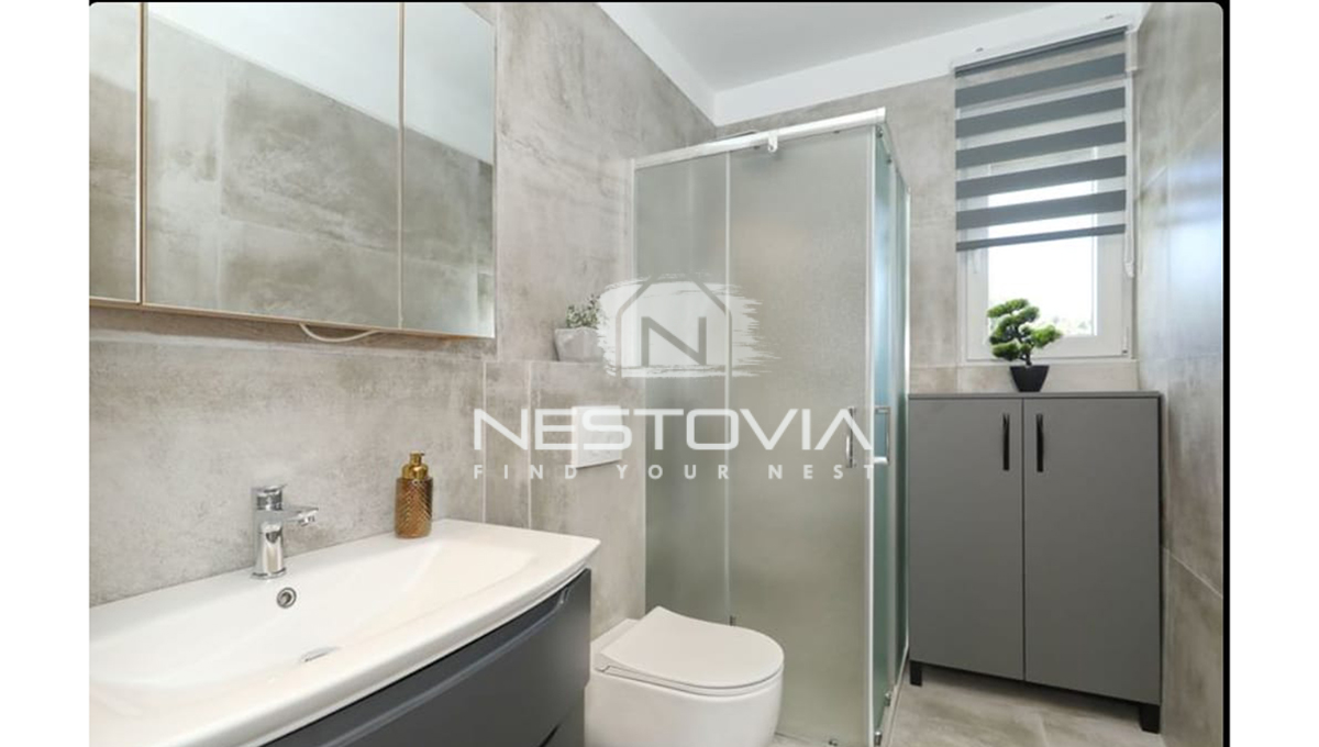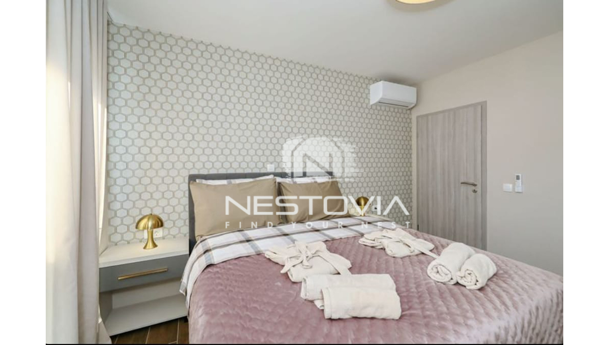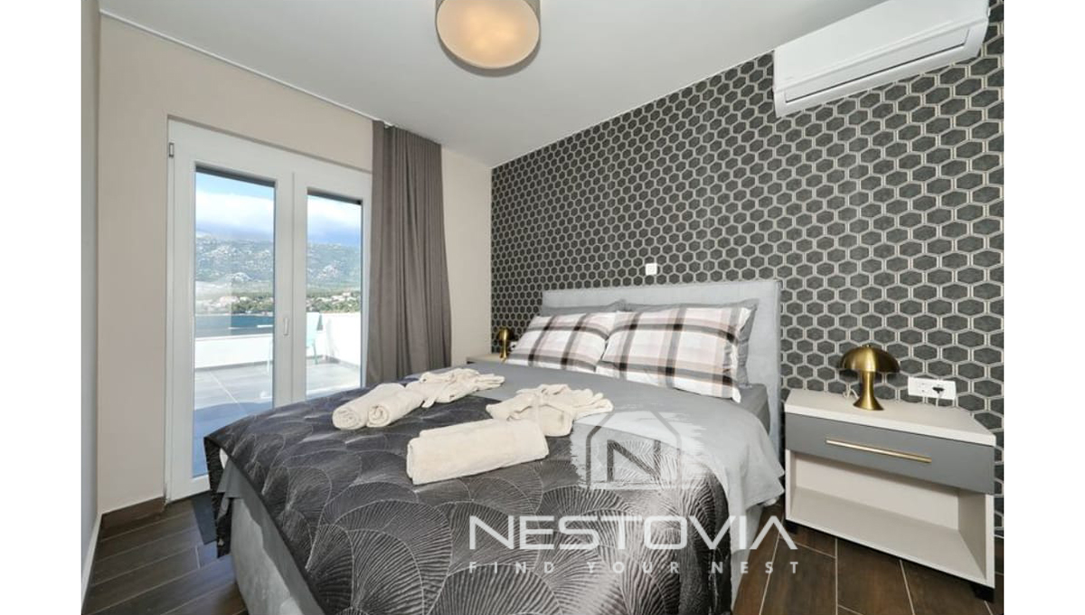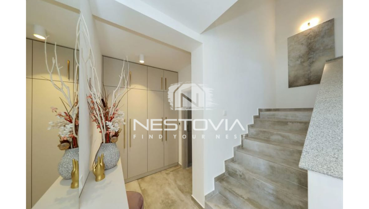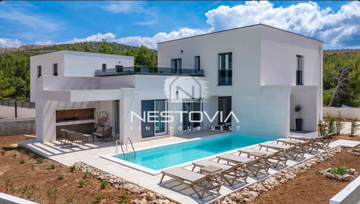 The master bedroom opens onto a large, elevated terrace, which is ideal for sunbathing, relaxing, and admiring the stunning views of the Velebit mountain range, which delight every day. Outside, there is a beautiful outdoor swimming pool and a terrace with a barbecue, perfect for socializing and spending time outdoors. In the immediate vicinity of the property, there is a sandy beach only 30 meters away, and in the area, there is a beach bar, barbecue bar, grocery store, church, and numerous attractions.