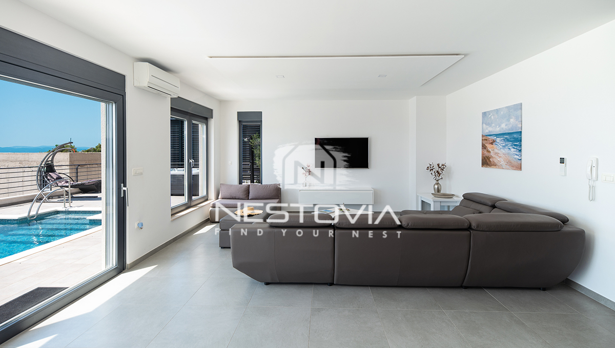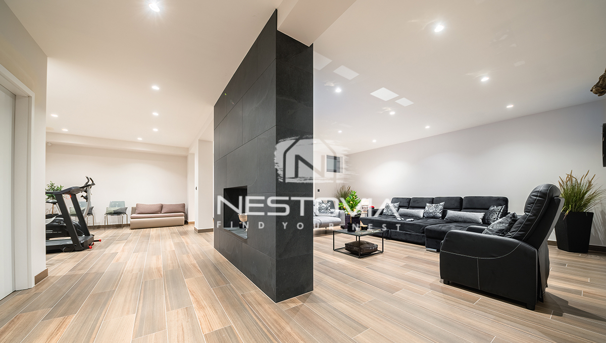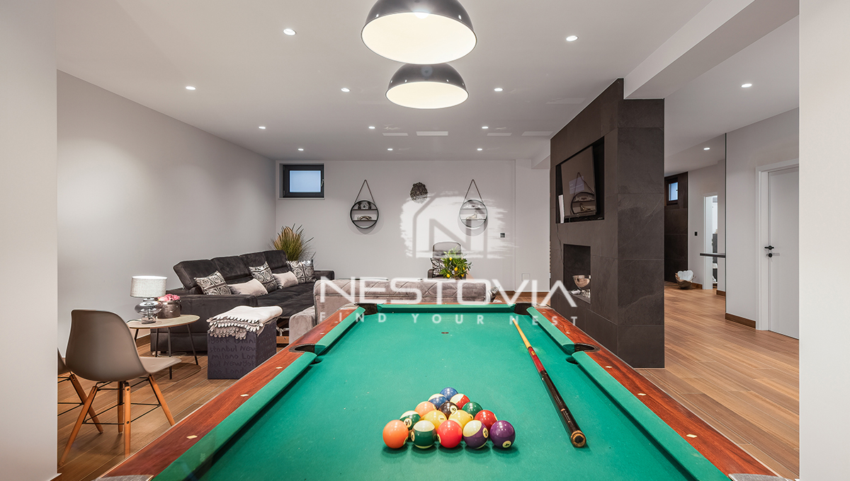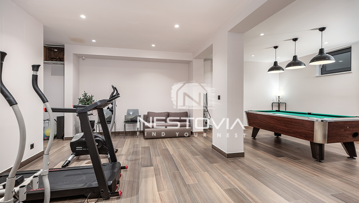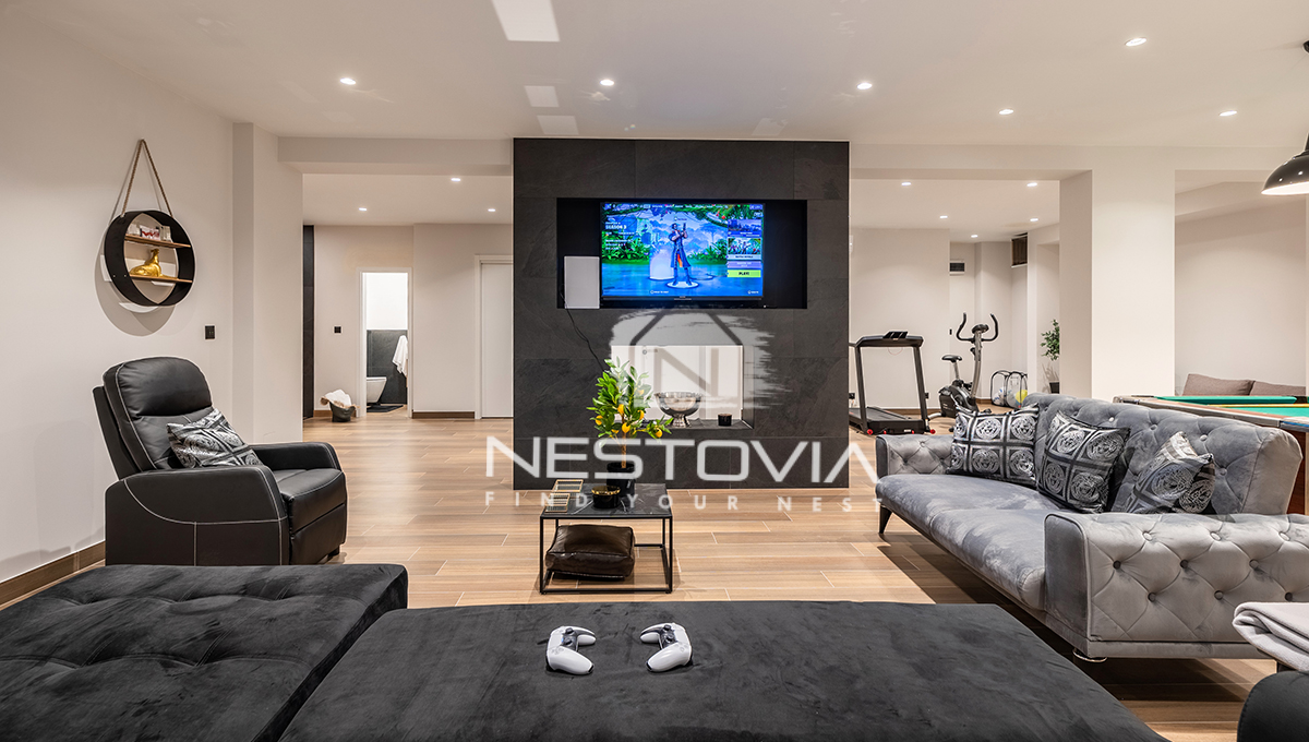 The villa has been finished to the highest standard, using premium materials and technical solutions to ensure complete comfort. The entire property is decorated in a luxurious style, as evidenced by its A+ energy rating and attention to every architectural and functional detail. The interiors are fully air-conditioned, and large windows open up the space to panoramic views. A relaxation area with a heated pool and jacuzzi is located in the garden, allowing you to enjoy the Mediterranean weather year-round. Additional amenities, such as a private sauna, gym, and entertainment room with billiards, enhance the comfort of your stay and make this property ideal for both private relaxation and luxury rentals. Modern installations, a beautifully landscaped plot, and convenient on-site parking spaces complete the overall experience.