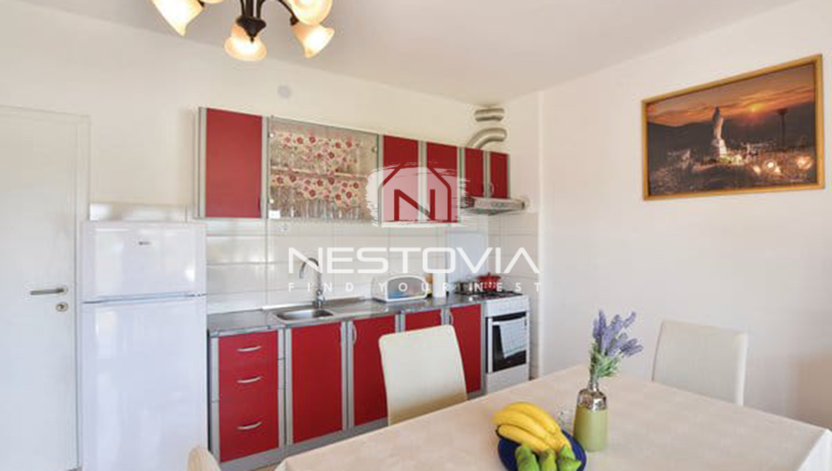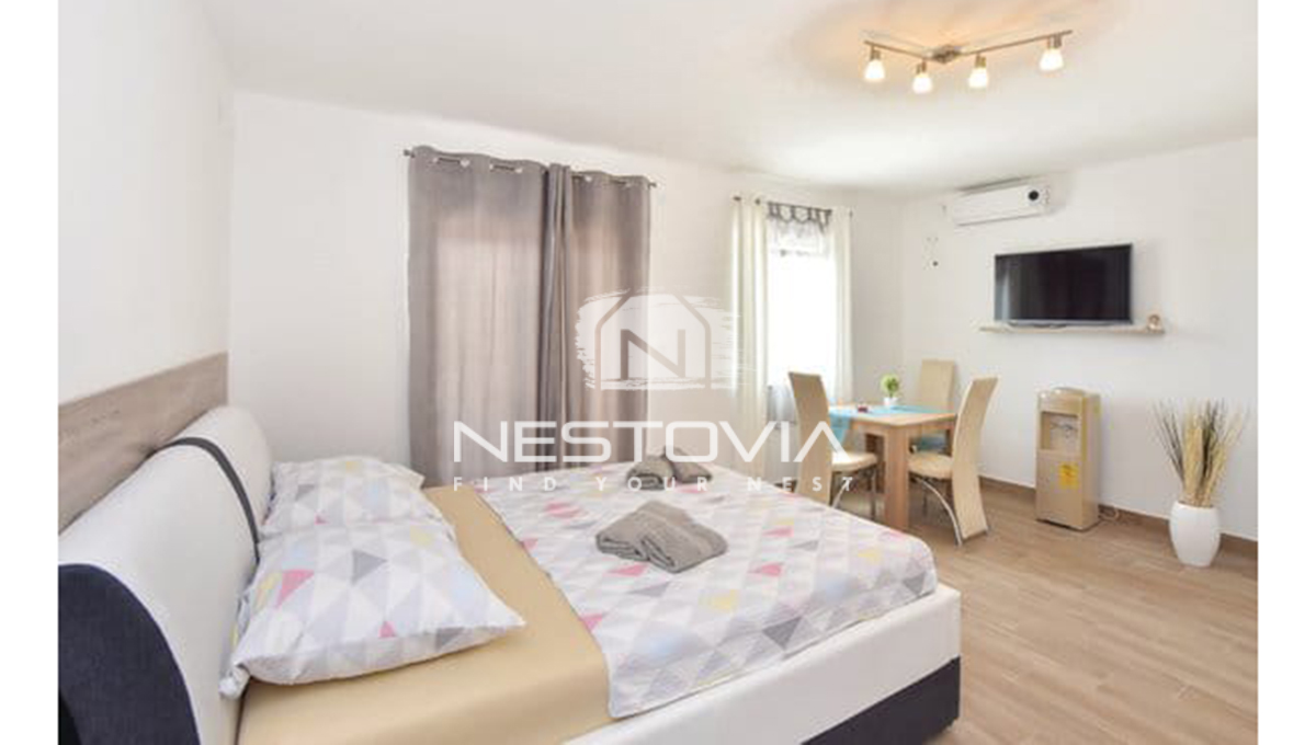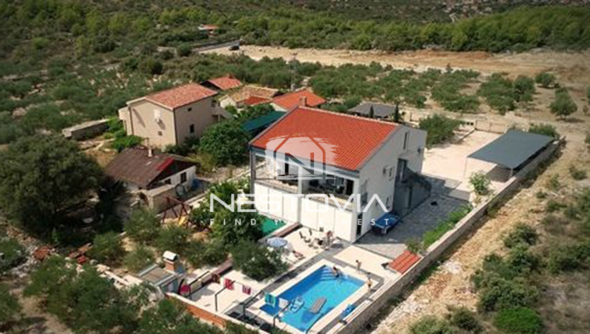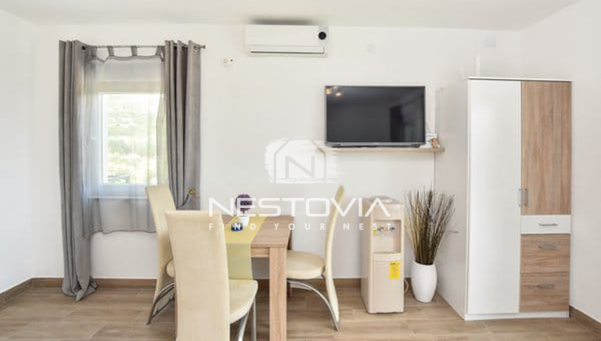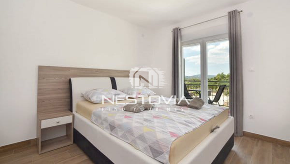 This unique terraced house is for sale, located in the quiet and picturesque village of Vrsine, near the Marina and Trogir. The property combines modern design with functionality, offering a private pool and comfortable interiors, ideal for relaxation or as a tourist rental. It’s an excellent option for those seeking an escape from the hustle and bustle of the city surrounded by Mediterranean nature.