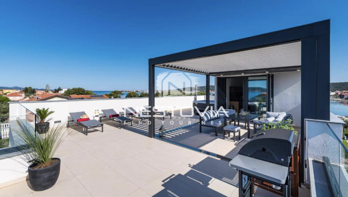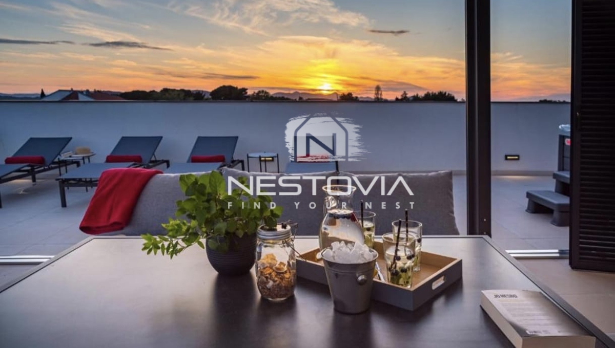 Pośredniczymy w sprzedaży ekskluzywnego penthouse’u położonego w prestiżowej miejscowości Sukošan, zaledwie kilka kroków od plaży (ok. 30–40 m). Nieruchomość znajduje się w drugim rzędzie od morza i mieści się na drugim piętrze kameralnego budynku mieszkalnego. To wyjątkowa propozycja dla osób poszukujących luksusowego apartamentu w sercu Dalmacji, idealnego zarówno do zamieszkania na stałe, jak i jako inwestycja wakacyjna.