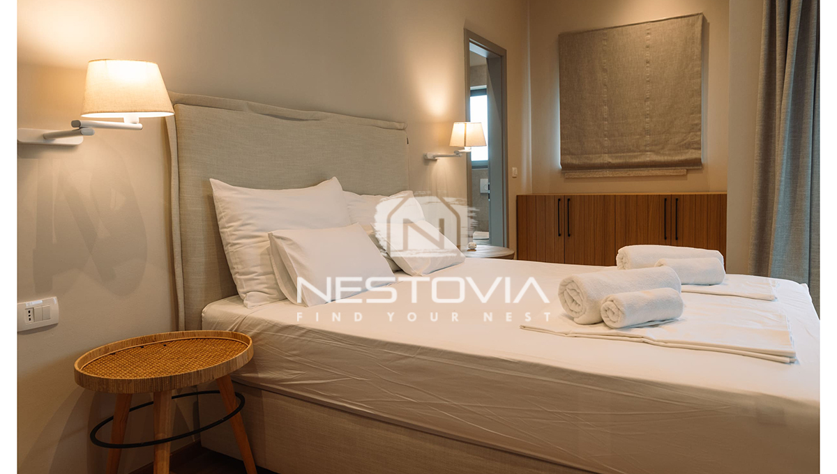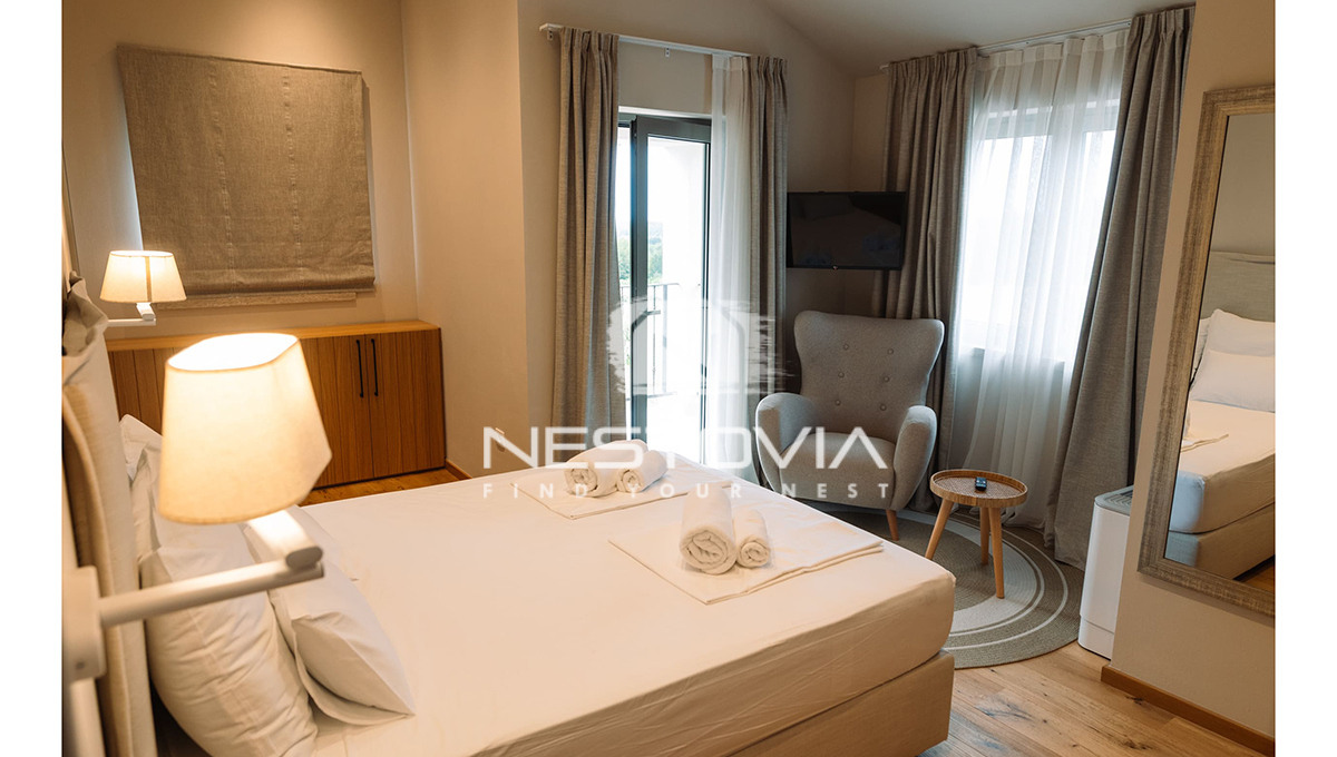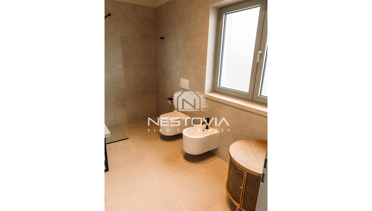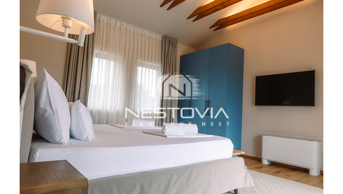 Obie wille zostały wybudowane w 2025 roku z zastosowaniem najwyższej klasy technologii i materiałów, łącząc nowoczesny design z elementami lokalnego kamienia Kanfanar. Budynki wyposażono w systemy pomp ciepła oraz ogrzewanie podłogowe, a aluminiowa stolarka Cortizo zapewnia doskonałą izolację. Wnętrza zostały wykończone przez profesjonalnych projektantów i wyposażone w meble marek premium oraz sprzęt kuchenny Electrolux. Każda willa posiada prywatny, podgrzewany basen, otoczony tarasami i starannie zagospodarowanym ogrodem. Posiadłość posiada kategorię 4 gwiazdek, co czyni ją gotowym produktem inwestycyjnym do wynajmu krótkoterminowego.